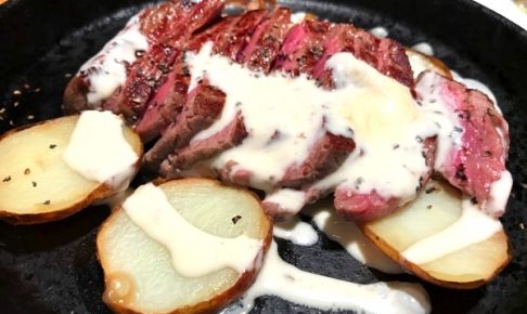 お肉は期間限定メニューの「サーロインステーキ」を注文。ロックフォール(ブルーチーズ)をたっぷりとかけて食べます。ブルーチーズはそんなに好きじゃないんですが、これは美味しく食べられました。